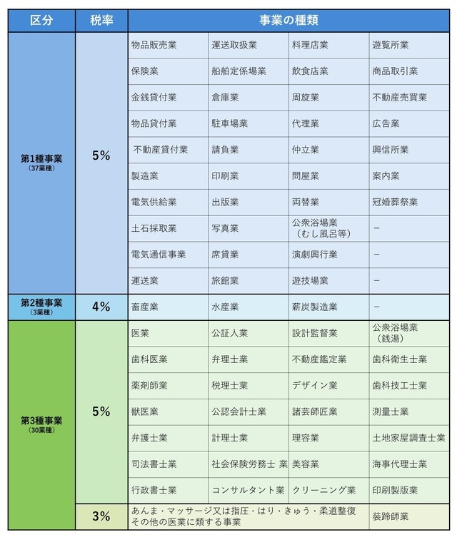 課税対象となる事業は、第一種事業、第二種事業および第三種事業です。これに業種区分ごとの税率を適用して税額が決定します。第1種は、物品販売業、不動産貸付業、飲食店業などの商工業で、5%です。第2種は、畜産業、水産業などで、4%です。第3種は、医業、弁護士業、理容業などの自由業が5%、マッサージ業、助産婦業などの業種が3%です。