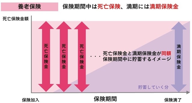 養老保険とは、保険期間中に被保険者が死亡または高度障害状態となったとき、保険金が支払われ、保険期間満了時まで生存したときは満期保険金を支払われる保険です。死亡保障に貯蓄機能が加えられた保険です。