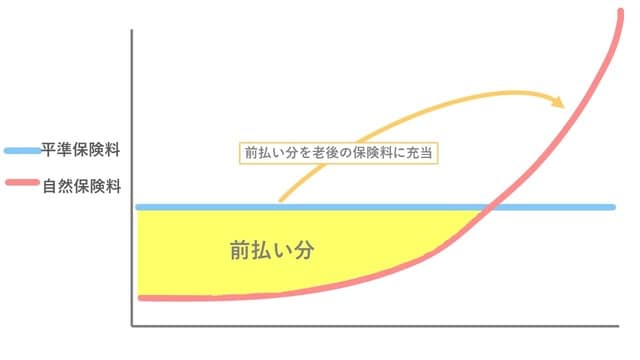 そこで、契約期間にわたって保険料が一定となる方法が考えられたのです。これは、平準保険料です。これは、自然保険料が安い若い頃に将来の保険料を前払いしておくことで、将来の保険料の準備をしておこうとするものです。つまり、保険料に保障だけでなく貯蓄が組み合わされているのです。