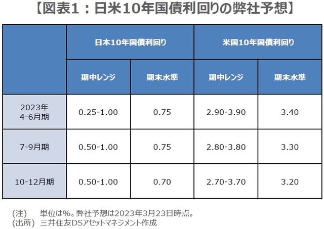 植田新体制で最初の金融政策決定会合は、4月27日、28日に開催されますが、弊社はここでYCCの修正、具体的には、10年国債利回りの操作目標(ゼロ%程度)の許容変動幅について、上下0.5%から1.0%への拡大が決定されるとみています。一方で、マイナス金利政策は維持され、緩和継続の姿勢が示されると思われます。YCC修正の結果、10年国債利回りの水準は切り上がり(図表1)、過度な歪みは解消に向かう公算が大きいと考えています。