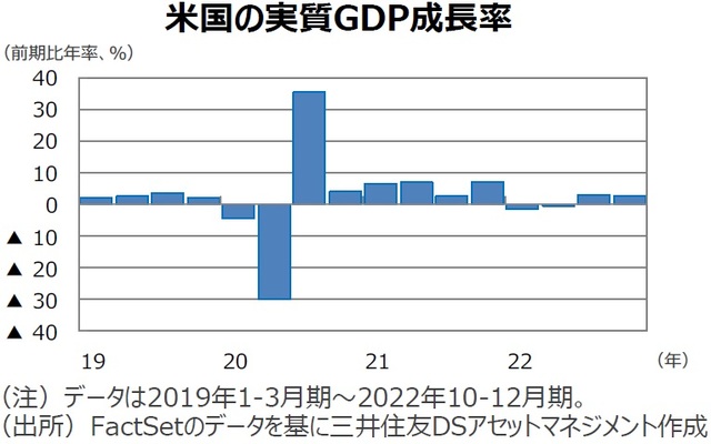 米国の10-12月期の実質GDP成長率は前期比年率+2.7%と、2四半期連続のプラス成長でした。高インフレの下でも個人消費が底堅く推移しました。