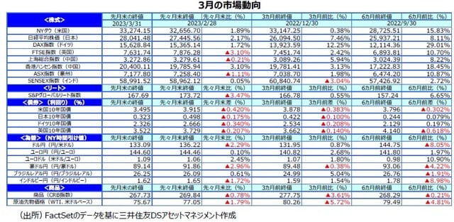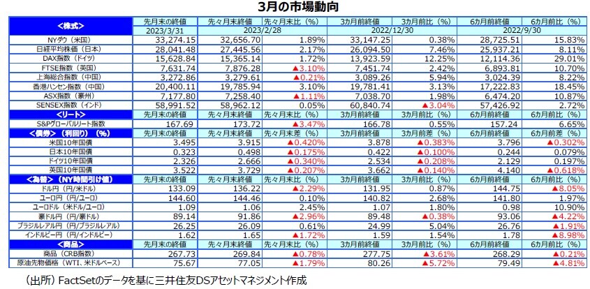 3月の主要国の株式市場は高安まちまちとなりました。米国株式市場は、シリコンバレーバンク(SVB)が経営破綻したことを受けて、金融システム全体に波及するリスクへの懸念が高まったことから一時急落しましたが、金融当局の迅速な対応により金融不安が和らいだことで買い戻され、小幅高となりました。欧州の株式市場も、スイス金融大手の株価急落で金融不安が高まり、下落しましたが、米株に連れて戻り歩調となりました。日本の株式市場は、欧米の株式市場が下落するなかでも比較的底堅く推移し、月末にかけ上昇して終了しました。中国株式市場では、米欧の金融不安への警戒が嫌気されたものの、経済再開への期待が支えとなり、上海総合指数がほぼ横ばい、香港ハンセン指数は上昇しました。