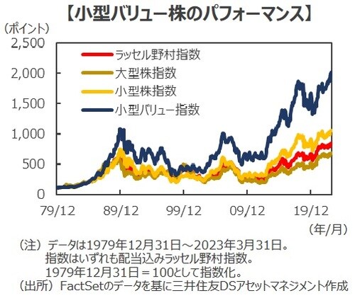 ■バリュー株の有利さに、こうした中小型株特有の利点が加わることで、中小型バリュー株投資は1980年以降、年率13%近いリターンを記録して他の投資スタイルを圧倒しています。もちろん過去のデータが将来の高リターンを保証するものではありませんが、割安株が上昇すると「割安株でなくなり」、中小型株が上昇すると時価総額が増加して「中小型を卒業する」ことから、他の投資スタイルとの比較で、中小型バリュー株投資は構造的な優位性があると見て良さそうです。
