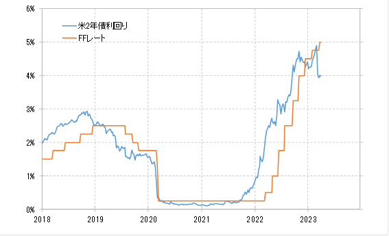 ところで、米2年債利回りは先週末の段階でも4%程度での推移となっており、現在5%の政策金利FFレート誘導目標上限を1%程度と大きく下回っています(図表4参照)。