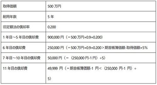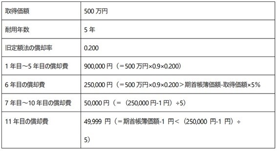 取得価額の95%相当額まで償却した年(度)分の翌年(度)分以後は、期首帳簿価額から1円(備忘価額)を控除した金額を5で割った金額を償却費の額とし、1円まで均等償却します。