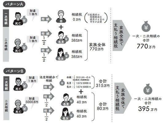 一方、父親が亡くなり(一次相続)、母親が法定相続分で相続した場合、母親5000万円、2人の子ども2500万円ずつの相続税は、母親は0円、子どもは2人合わせて315万円。次に母親が亡くなり(二次相続)、母親の5000万円に対する子どもの相続税は合わせて80万円。