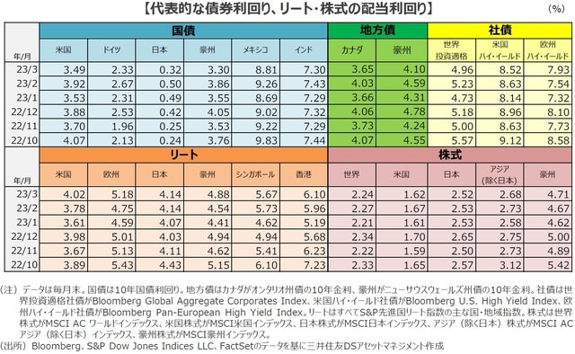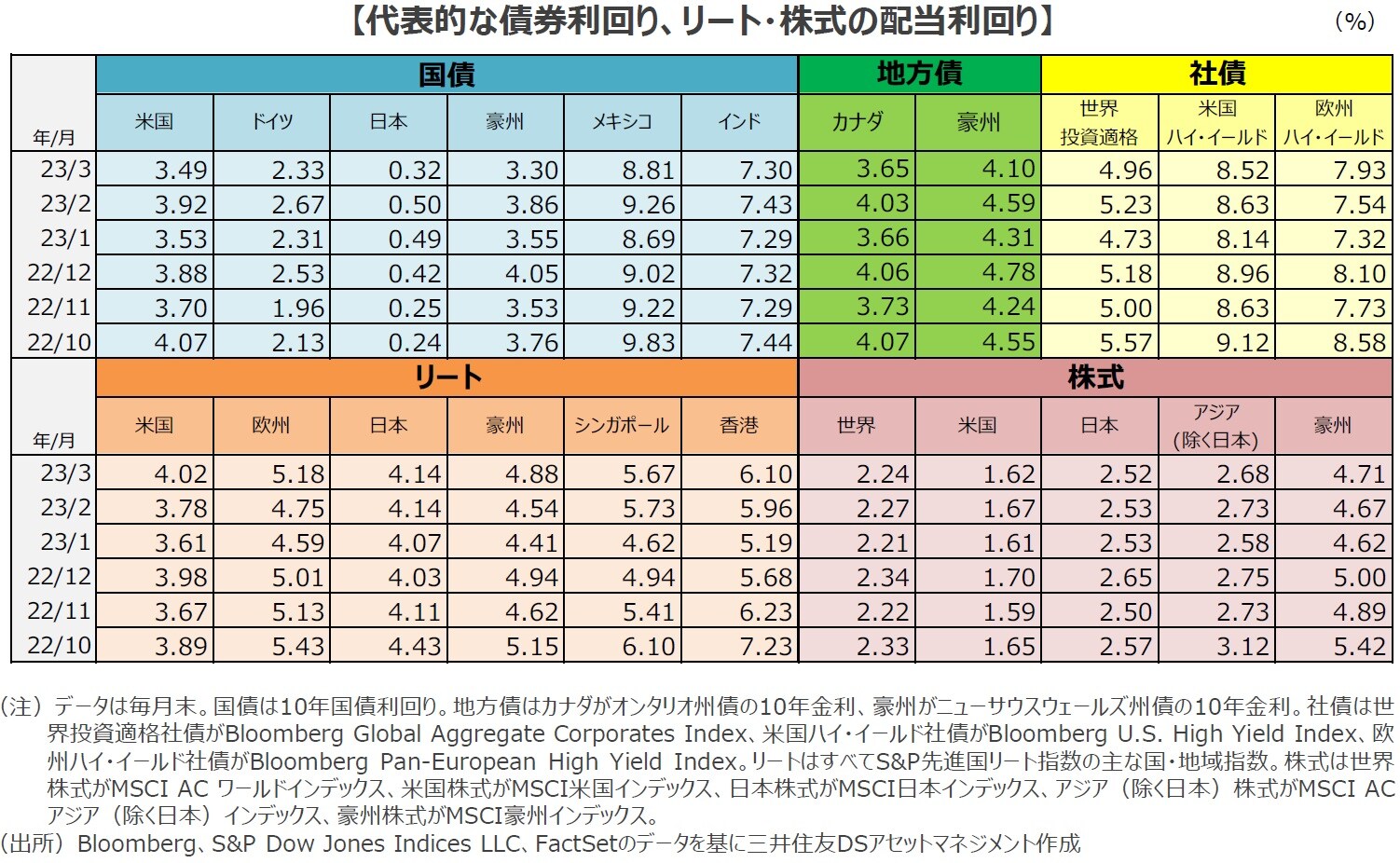 ■株式市場は、SVBの破綻を契機とする金融不安の高まりで一時急落しましたが、金融当局の迅速な対応により金融不安が和らいだことで月末にかけて買い戻されました。主要国の株式市場が高安まちまちとなるなか、配当利回りは概ね小幅に低下しました。