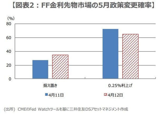 CPIの発表を受け、米国市場では、長期金利低下とドル安の反応がみられ、ダウ工業株30種平均など、主要株価指数は上昇して取引が始まりました。ただ、フェデラルファンド(FF)金利先物市場に目を向けると、5月2日、3日の米連邦公開市場委員会(FOMC)における25ベーシスポイント(bp、1bp=0.01%)の利上げ確率は、前日からやや低下しましたが、依然として利上げ実施の見方が優勢です(図表2)。