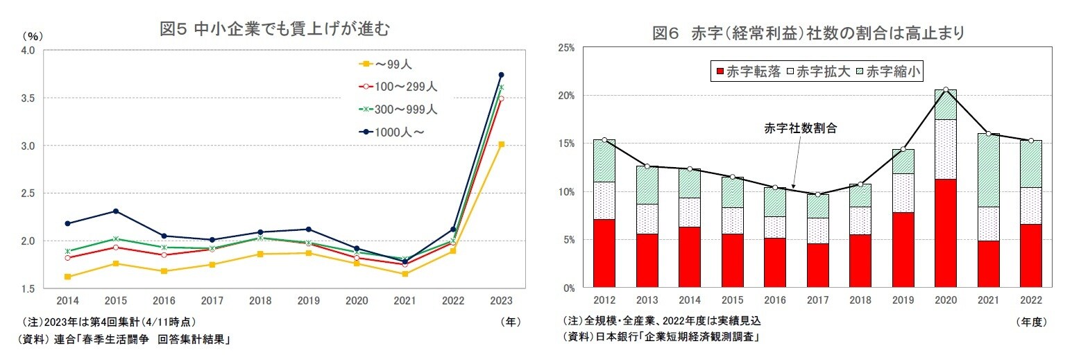 日銀短観で経常利益が赤字の社数割合を確認すると、2018年度の10%程度から企業収益が急速に悪化した2020年度には20%程度まで急上昇した。赤字社数の割合は2021年度、2022年度とやや低下したものの、15%程度で高止まりしている(図6)。