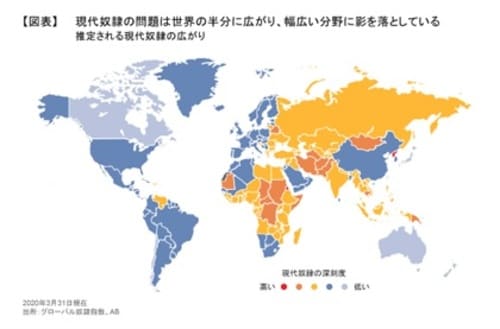 現代の奴隷労働は、企業の事業やサプライチェーン上において強制労働や他の人権侵害が行われていることを指し、公式には違法とされています。ただ、先進国を含む多くの国ではいまだにそれがまん延しています[図表1]。