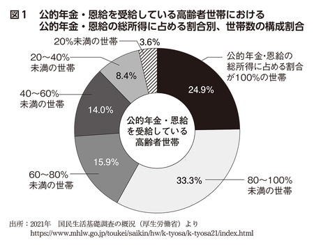 じつは、毎年の調査では、年金だけで収入の100%を占める世帯は半数ぐらいはあるのですが、この図の調査は2020年に実施されたものなので、コロナ禍による特別定額給付金が入ったために、年金収入の割合は少し減っているのです。