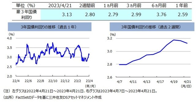 ここ2週間の豪州3年国債利回りは、上昇しました。期間中に発表された豪州の3月の雇用統計や消費者信頼感指数などが良好な結果だったことや、中国のGDP成長率や3月の小売売上高なども良好な結果だったこと、米雇用統計の発表を受けて米景気は堅調との見方が広がったことなどから米国債利回りが上昇したことにより、豪州3年国債利回りも上昇(債券価格は下落)しました。