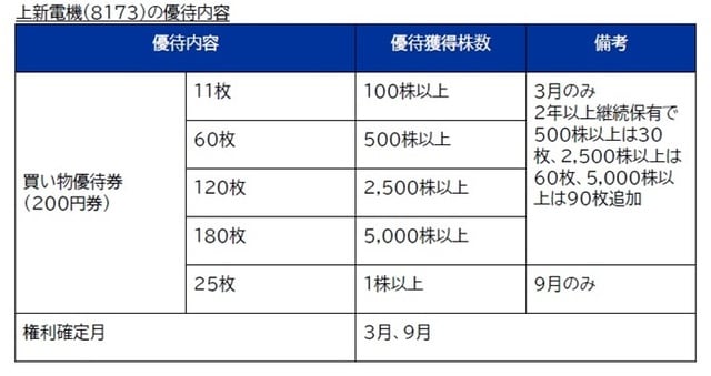上新電機は、関西地方を中心に家電製品や情報通信機器などの販売・修理事業を展開している企業です。株主優待として買い物優待券を提供しており、1株保有から優待対象となっているのが特徴です。