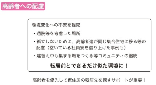 ただし、建替えが大規模の場合は、同時期に多くの世帯が仮住居を探すため、入念な計画が必要です。特に高齢者の場合、長く暮らした場所から移ることは、ご近所付き合いやかかりつけの病院への通院等、環境を変えたくないという意識がより強いので、優先して仮住居を探す配慮が重要です。