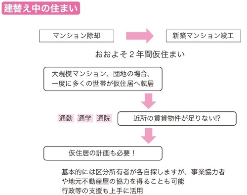 このように、仮住まいは、建替え後のコミュニティ形成にも大きな影響をもたらすでしょう。事業協力者や近隣の不動産屋、行政等の建替えに伴う仮住居の支援等も上手に活用して、できるだけ建替え前の環境に近い仮住居を準備する配慮をしましょう。