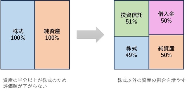 先生:基本は不動産です。不動産そのものの評価額が低いことは上述の通りです。区分所有マンションでも、商業ビル1棟でもいいでしょう。あとは、船舶や航空機でもいいでしょう。資産そのものの評価額は下がりませんが、投資信託やETFなどの金融資産を購入したり、法人契約の生命保険を契約したりしても株特外しの効果があります。