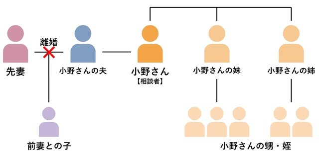 小野さんの姉には2人、妹には3人の子どもがいます。また、小野さんの夫は再婚で、先妻との間に息子が1人いるそうです。そのため、夫の相続人は配偶者と実子となり、相続時には、先妻の子どもが登場することになります。