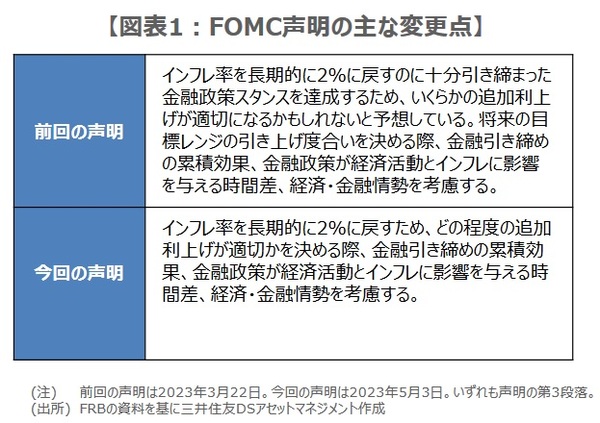 まず、FOMC声明について、主な変更点は図表1の通りです。前回は、「インフレ率を2%に戻すため、いくらかの追加利上げが適切になるかもしれないと予想しており、利上げの度合いを決める際、金融引き締めの累積効果や時間差などを考慮する」という趣旨でしたが、今回は「インフレ率を2%に戻すため、どの程度の追加利上げが適切かを決める際、金融引き締めの累積効果や時間差などを考慮する」という趣旨に変更されました。