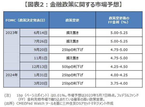 以上より、今後の政策判断は、信用条件の引き締まり度合いを含め、経済データ次第とみられ、弊社は今回のFOMCについて中立的と考えています。6月のFOMCについては、追加利上げの可能性も残りますが、基本的には6月のFOMC以降、FF金利は年内いっぱい据え置きを予想しています。なお、市場では年内利下げの織り込みが進んでいますが(図表2)、この織り込みは、今後の経済データ次第で大きく変化する可能性が高いとみています。