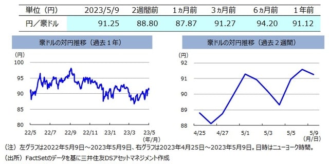 ここ2週間の豪州3年国債利回りは、小幅に低下しました。4月26日に発表された豪州の2023年1-3月期の消費者物価指数では、基調的な動きを示すトリム平均値が市場予想を下回るなど、インフレ圧力の緩和が見られました。このため、5月2日のRBAの金融政策決定会合では政策金利据え置きの市場予想が多かったなかで、RBAが0.25%の利上げを実施したことから、豪州3年国債利回りは一時上昇しました。しかしその後、米国銀行セクターをめぐる懸念が再燃して米国国債利回りが低下したことから、連れて豪州3年国債利回りは小幅な低下(債券価格は上昇)となりました。