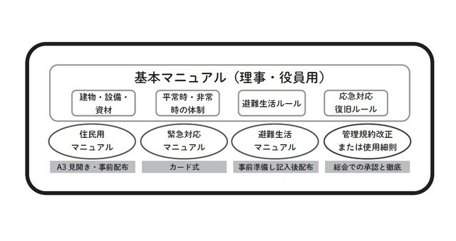 理事や役員が読む全てを網羅したマニュアルです。建物、設備、資材に関する情報、平常時・非常時の体制、被災生活のルール、応急対応時のルールなど災害対応に必要なことを全てまとめておきます。