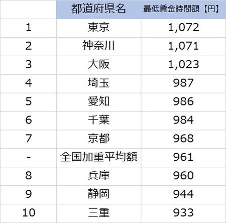 最低賃金1位~10位