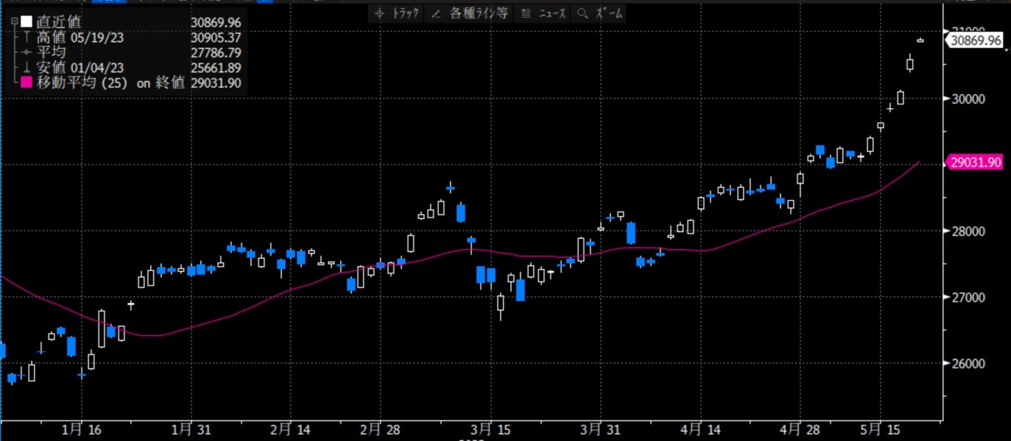 それをよく認識している外国人の買いが途切れない。昨日発表された5月第2週の投資部門別売買向によると、海外投資家は7週連続の買い越しだった。7週連続の買い越しは2020年11〜12月以来、約2年半ぶり。累計の買越額は2兆9,000億円弱に達している。
