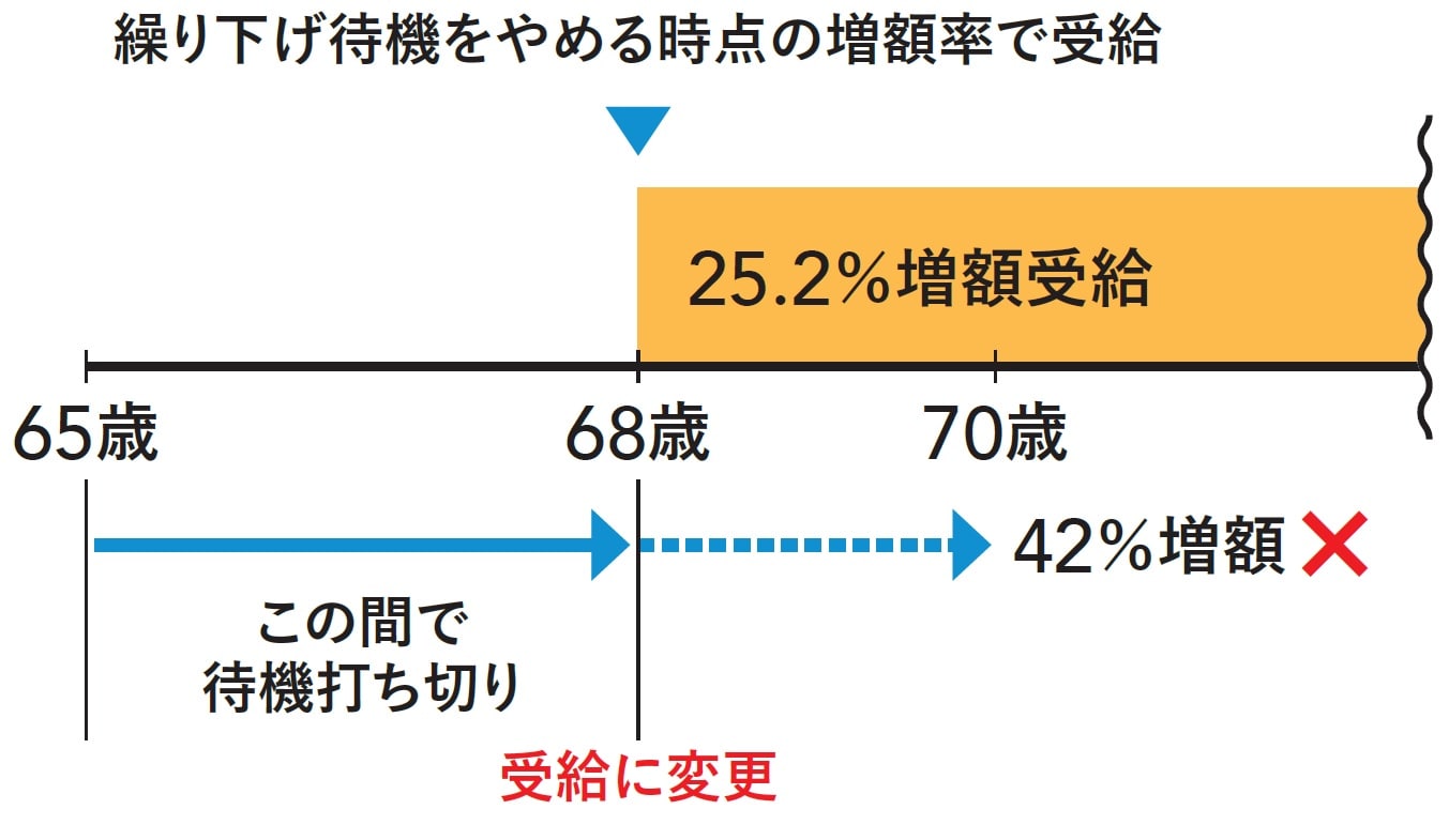 70歳になったら年金請求しようと計画していた人が68歳0カ月で待機をやめて年金請求をすると、68歳時点の増額率25.2%で増額した年金を一生受け取れます。