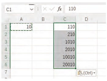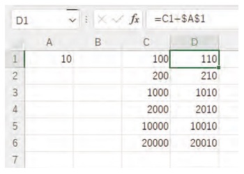 たとえばC列の値すべてに、A1セルの値(10)を足すとします。D1セルに「=C1+$A$1」としてもいいのですが、列が1つ増えてしまいます(図表12・13)。