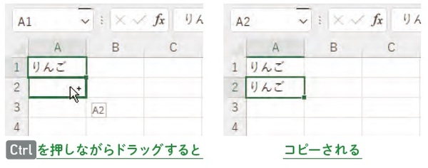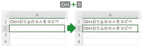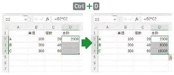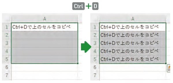 【Ctrl】+【D】は下(Down)にコピーなので【D】、【Ctrl】+【R】は右(Right)にコピーなのでRで覚えましょう。