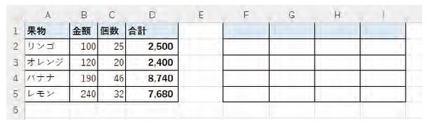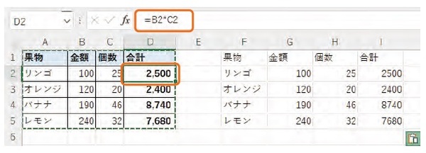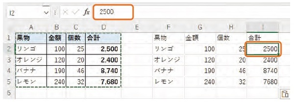 D2セルは「=B2*C2」の数式ですが(図表5)、値の貼り付けをしたI2セルは「2500」という値になっています(図表6)。
