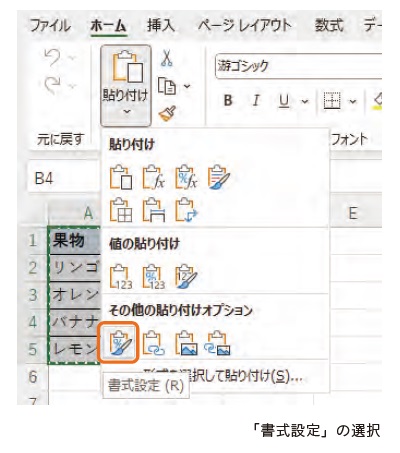 逆に書式のみ貼り付けたいときは、貼り付けオプションから「書式設定」を選択します(図表7)。