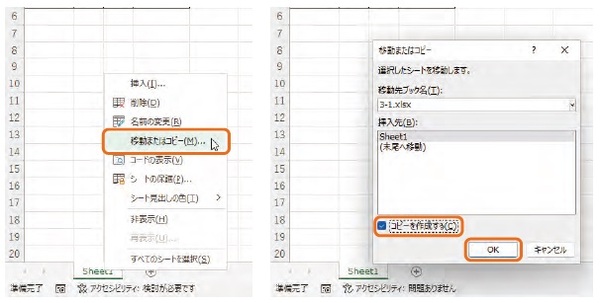 シートのコピーって割と面倒ですよね。シート見出しを右クリック→[移動またはコピー]→[コピーを作成する]をチェック→[OK]をクリック。こんなに手順を踏んで、やっとシートがコピーされます(図表18)。