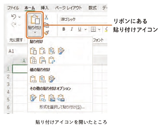 貼り付けにはいろいろな種類があります。貼り付けアイコン(図表1)をクリックしてみてください。もちろん全部覚える必要はありません。