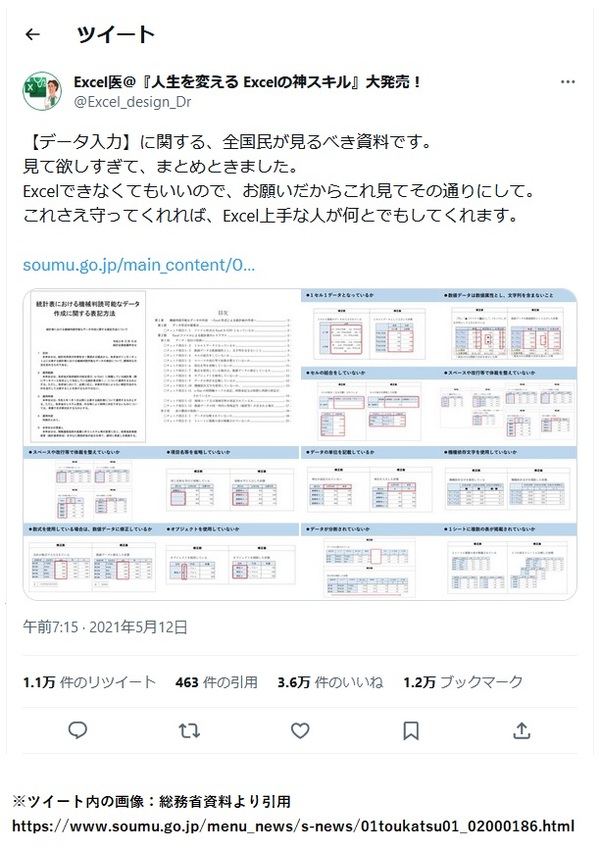このデータベースを作る際に大事になってくるのが、データ入力の統一ルールです。以前、総務省の統計局が示した、データ入力の統一ルールについてのツイートがバズりました(図表1)。