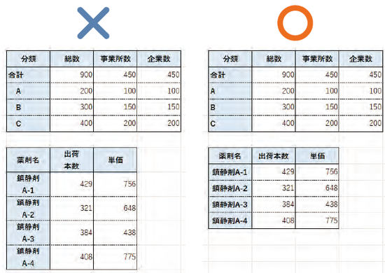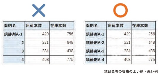【鎮静剤A-1】以降はすべて番号の部分しか記載されていません。2とか3といった数字だけでは何のことかわかりませんし、実際の数値データと区別がつきません。