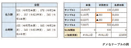 左の例では、1つのセルに複数のデータが含まれていて、データが文字列になっています。右の例も、データに「円」や「▲」といった文字列が含まれていて、データ自体が文字列となっています。そのため、右の表ではSUM関数の結果や足し算の結果がおかしくなっています。