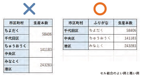 左は【市区町村】と【ふりがな】を上下に並べ、【生産本数】が1つのセルに結合されています。こうすると、「ちよだく」「58406」のセットなのか「千代田区」「58406」のセットなのか、対応関係が不明確となり、読み取りに支障が出てきます。正しく入力するには、右のように【ふりがな】の列を作り、1行のデータにしましょう。