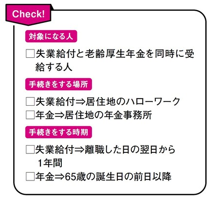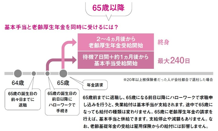 基本手当と年金を同時に受けたいという人は、このしくみを利用して、65歳になる前々日までに退職し、65歳の誕生日の前日以降にハローワークで求職申し込みを行う手もあります([図表3]参照)。