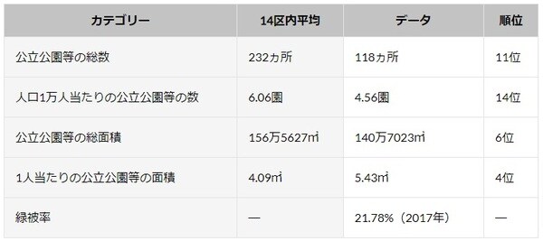 人口 1万人当たりの公立公園等の数は14区内平均では下位ですが、区内には有名な大きい公園が複数あります。特に日本最古の公園の1つである「港区立芝公園」は背後に東京タワーを望めるとあって区内外で人気の公園です。都内でありながら砂浜や磯が広がりビーチの楽しさを味わえる「お台場海浜公園」も人気スポット。休日は多くの人でにぎわいます。