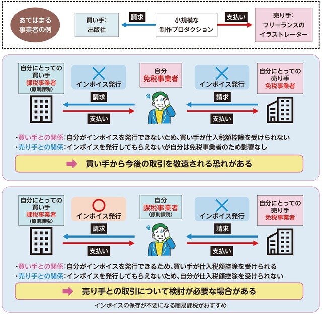 例えば、出版社から依頼を受けて本を制作するプロダクション、デザイナーなどがあてはまります。売り手には、免税事業者が多い業界です。この場合、自分が免税事業者だと出版社との取引に影響が出るほか、課税事業者になるとライターなどに支払った消費税を控除できない可能性があります。その場合は、売上高5000万円以下なら、「簡易課税」の選択がおすすめです。