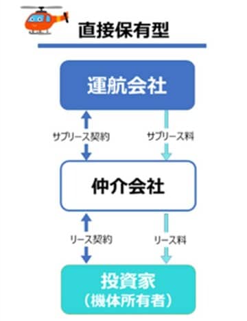 仕組みとしては、先述したように主に「直接保有型」という形態を取ります。先ほどの匿名組合型に比べるとシンプルで、投資家自身が機体の所有者となり、仲介会社を通して運航会社にリースし、リース料を受け取ります」