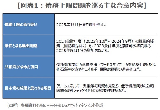 なお、債務上限の適用停止の条件となる歳出削減については、2024会計年度(2023年10月~2024年9月)の裁量的経費(国防費は除く)を、2023会計年度とほぼ同水準に抑え、2025年度は1%の増加を認める内容になっています(図表1)。歳出削減の規模は、共和党の独自案(4月に下院で可決)から大幅に縮小されましたが、共和党が求める低所得者向けの食糧支援(フードスタンプ)の支給条件厳格化などは盛り込まれました。