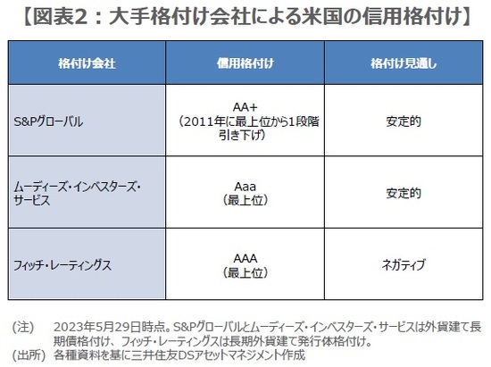 合意案が法律として成立した場合でも、米国の信用格付けの動向を見極める必要があります。大手格付け会社フィッチ・レーティングスは5月24日、米国の長期外貨建て発行体格付けの見通しを「ネガティブ」にしたと発表しました(図表2)。同社は、Xデー(米政府の資金繰りが行き詰まる日)までに債務上限を引き上げるか、適用停止としなければ、「AAA」格付けからの引き下げを示唆しています。