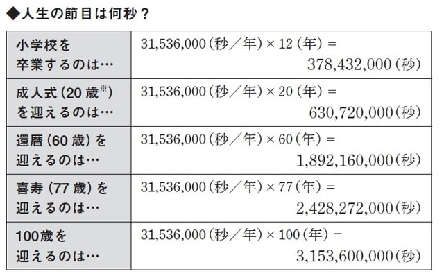 六十歳の還暦では十八億九千二百十六万秒、七十七歳の喜寿では二十四億二千八百二十七万二千秒、百歳では三十一億五千三百六十万秒と、とてつもなく大きな数になっていきます。