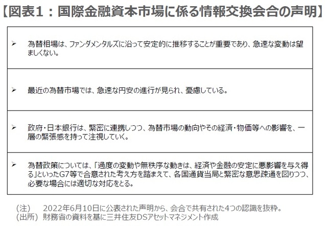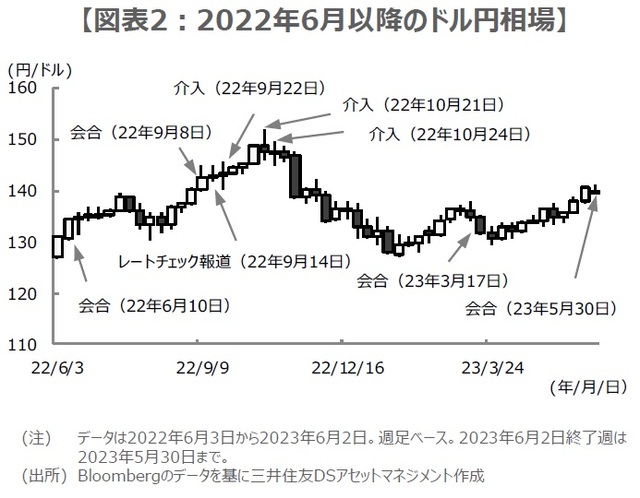 3者会合は円相場が大きく動く局面で開催される傾向がありますが、政府・日銀には開催によって為替市場の投機的な動きをけん制する狙いがあると考えられます。実際2022年の動きを振り返ると、3月以降に急速なドル高・円安が進行したことを受け、6月10日に3者会合が行われ、会合後に初めて声明文が公表されました(図表1)。ただ、その後もドル高・円安の流れが続いたため、9月8日に再び3者会合が開催されました(図表2)。