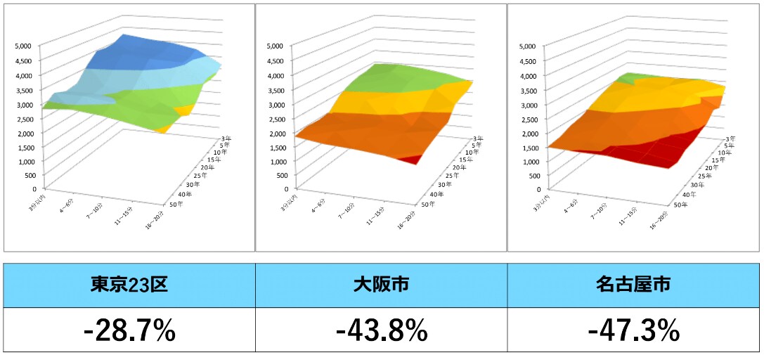 東京23区は、30年平均で28%家賃が下がります。大阪は同43%、名古屋は同47%下がる。東京23区でも港区と板橋区では下落率が違います。しかし、不動産業界では、募集広告などに不動産価格と表面利回りしか書かれていません。これでは投資家が投資に失敗するのは当然ともいえるのではないでしょうか」