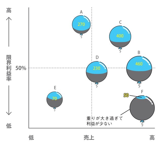しかしその内容を見てみると、Fはかなり多くの変動費を使っているため、限界利益はたったの50万円しかありません。これを風船に置き換えてみると一目瞭然。最も高く浮き上がっているのはAであり、Fは地面スレスレを飛んでいることが分かります。