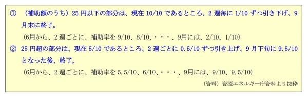 つまり、「ガソリン価格(補助前) と基準価格(168円)の差」について、①25円以下の部分については、2週ごとに補助率(5月までは100%)が10%分ずつ引き下げられるが、②ガソリン価格(補助前)が急騰して同差額が25円を超える場合に適用される補助率(5月までは50%)は2週ごとに5%分ずつ引き上げられる。