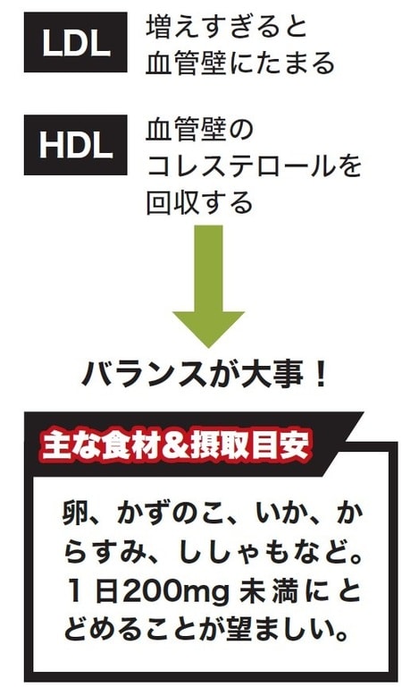 量は体内で調整されるため、摂取の目標値を設定するのは困難だが、バランスが崩れると脂質異常症につながるため要注意。動脈硬化の原因にもなる。